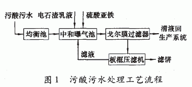 污酸污水處理工藝流程如圖1。來(lái)自冶煉系統(tǒng)和制酸系統(tǒng)的污酸污水引人均衡池混合;混合后,污酸污水由泵輸送到中和曝氣池,達(dá)到一定液位后,向中和曝氣池內(nèi)投加、[Ca (O H ),」為20%左右的電石渣乳液,調(diào)整pH值為7.8一8.0,使污酸污水中的氟離子、重金屬離子和部分砷沉淀,再根據(jù)污酸污水中砷化物含量投加適量FeS04,同時(shí)向混合液中通人壓力為50 kPa左右的空氣進(jìn)行攪拌并起氧化作用,保證反應(yīng)充分并促進(jìn)Fe(OH)2氧化成絮凝效果好的Fe(OH)3膠體,將廢水中的亞砷酸及亞砷酸鹽沉淀;曝氣反應(yīng)完全后,根據(jù)污酸污水中重金屬離子含量的高低,決定是否微調(diào)pH值至8.5一9.0 ; 中和曝氣反應(yīng)后的污酸污水通過(guò)戈?duì)柲み^(guò)濾器進(jìn)行固液分離,上部清液達(dá)標(biāo)返回生產(chǎn)系統(tǒng)循環(huán)利用,底流經(jīng)板框壓濾機(jī)壓濾,濾渣無(wú)害化堆存,濾液返回中和曝氣池。